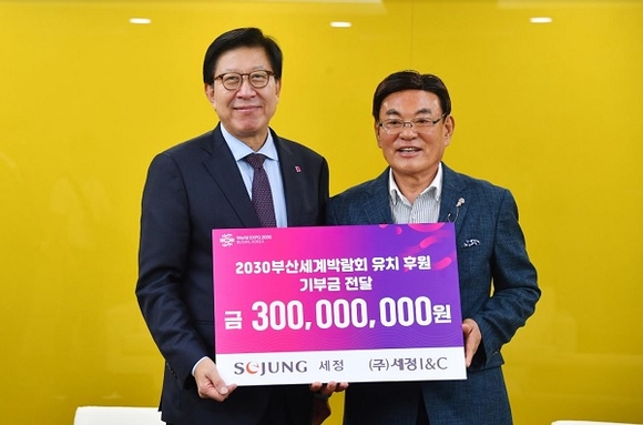 이번 전달식은 향토기업인 세정그룹, 세정, 세정아이앤씨에서 2030부산세계박람회 유치 후원을 위해 마련한 기부금을 전달하고자 마련됐다.