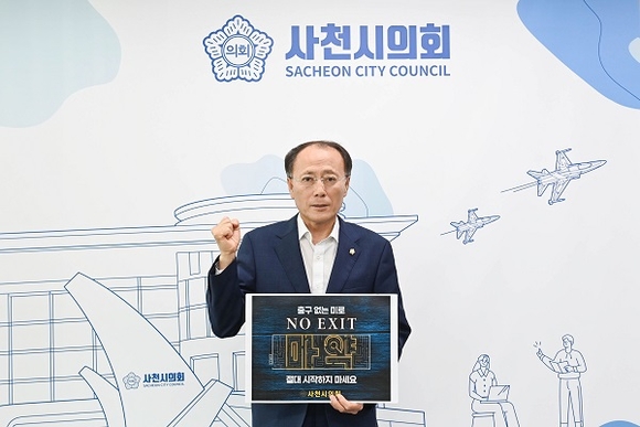 사천시의회 윤형근 의장이 21일 마약범죄 예방을 위한 캠페인 'NO EXIT' 마약 예방 릴레이 챌린지에 동참했다.