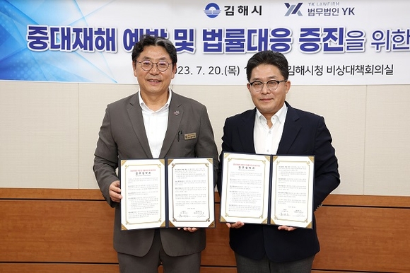 경남 김해시는 지난 20일 시청 비상대책회의실에서 소속 사업장의 중대재해 발생 시 신속 대응이 가능한 법률 체계를 구축하고자 법무법인YK와 업무협약을 체결했다.