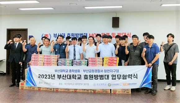 부산대학교 총학생회는 금정경찰서 장전지구대와 지난 20일 효원방범대 업무협약을 체결한 후 단체 기념촬영을 했다. (사진=부산대 제공)