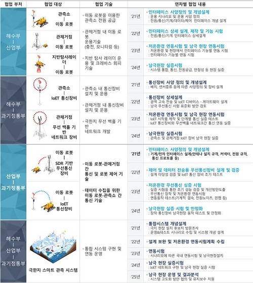 이번 시연회는 올해 11월부터 남극에서 수행할 극한지 개발 및 탐사용 이동체 현장 실증시험에 대비한 사전 점검으로 각 부처의 통합시스템 구현과 연동이 원활히 작동되는지 관측소, 관제거점, 이동로봇 연동 실증을 국내 테스트베드에서 선보인다.