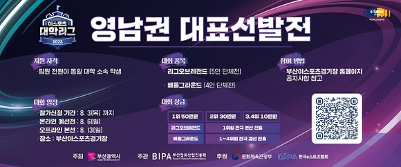 부산정보산업진흥원이 e스포츠를 통한 대학 간 교류 확대 및 대학 내 e스포츠 문화 활성화를 위해 오는 8월 ‘2023 이스포츠 대학리그 영남권 대표 선발전’을 부산이스포츠경기장(브레나)에서 개최한다고 밝혔다.