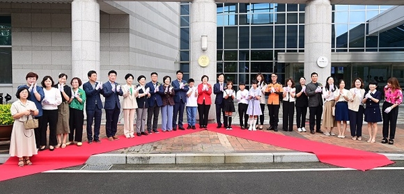 경남 진주시는 26일 시청 1층 로비에서 아동친화도시추진위원회 위원 등 관련단체가 참석한 가운데 아동친화도시 인증 선포식 및 현판 제막식을 가졌다.