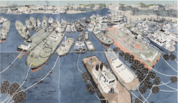 한지와 먹을 이용해 동양화의 스며드는 물성을 두각 시키는 배채(背彩) 기법으로 시간 속에서 퇴색되고 변화하는 장소들을 표현하고 있다.