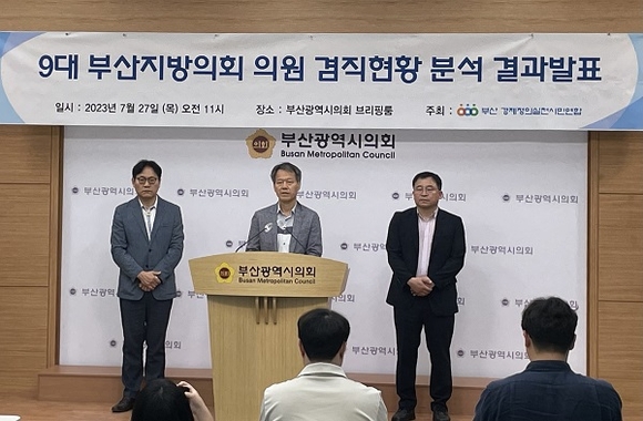부산경제정의실천시민연합은 27일 오전 부산시의회 3층 브리핑룸에서 기자회견을 열고 제9대 부산지방의회 의원 겸직 현황 분석 결과를 발표했다.