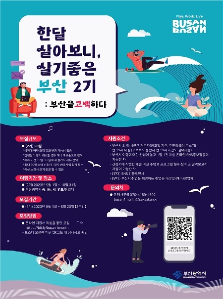 ‘한달 살아보니, 살기좋은 부산(2기)’ 참가자 모집은 오는 8월 1일부터 20일까지며 참가서류 심사를 통해 20개 팀(예정)을 최종 선발한다. 이들은 오는 9월 1일부터 10월 31일까지 ‘부산관광 홍보대사’로 활동할 예정이다.