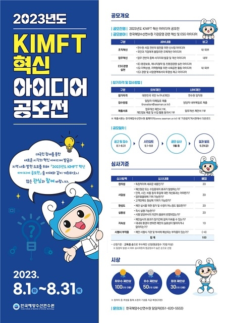 한국해양수산연수원이 대국민 참여를 통한 새로운 시각의 혁신 아이디어 발굴과 지역사회 발전 도모를 위해 8월 한 달 동안 ‘2023년도 KIMFT 혁신 아이디어 공모전’을 개최한다고 밝혔다.