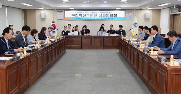 이날 회의는 지난 4월 조직문화개선과 구민체감 행정혁신 아이디어 발굴을 위해 출범한 ‘구정혁신추진단(2기)’의 활동성과를 발표하고 주민의견을 수렴하는 한편 행정․관광․건축 분야 전문가 자문을 위해 마련됐다.