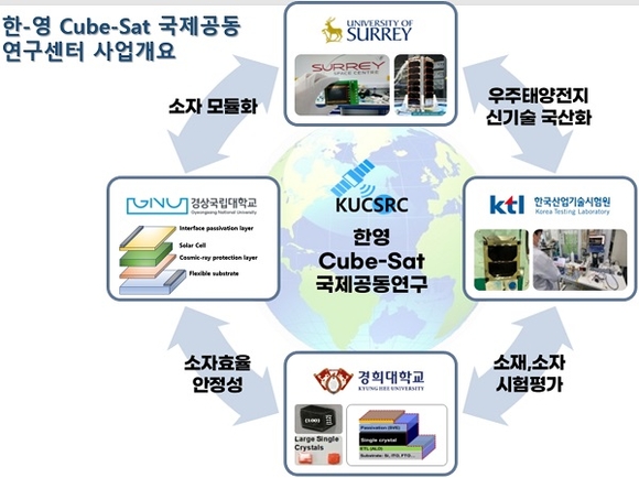 경상국립대학교 과학기술정보통신부의 '과학기술국제화사업'의 일환으로 추진된 '해외우수연구기관 협력허브구축사업'의 참여 기관으로 선정돼 '한-영 큐브 샛 국제공동연구센터'를 설립하고 '차세대 내방사선 강화 및 경량 우주태양전지 연구개발' 연구를 본격 추진한다.