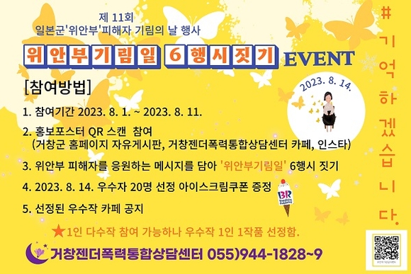 경남 거창군이 '제11회 일본군 위안부 피해자 기림의 날(8월 14일)'을 맞아 거창젠더폭력통합상담센터에서 내달 1일부터 11일까지 기념행사를 연다.