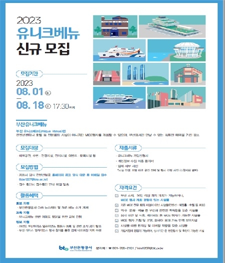 부산관광공사가 2023년 신규 부산 유니크베뉴(Unique Venue)를 오는 15일까지 모집한다고 밝혔다.