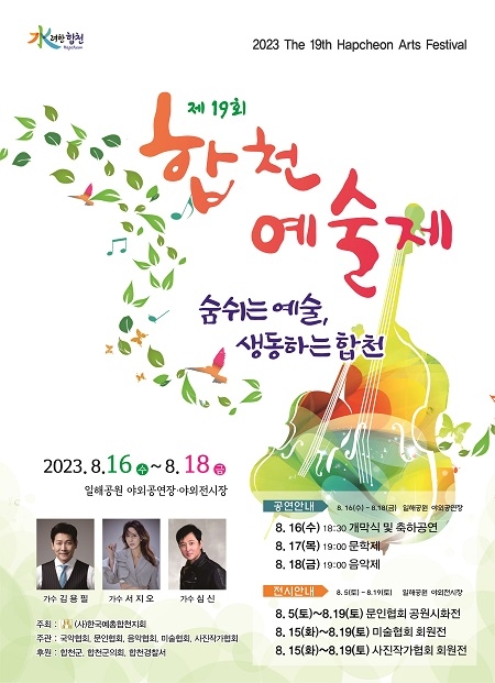 합천군민과 문화예술인이 함께하는 '제19회 합천예술제'가 오는 5일부터 19일까지 공연 및 전시행사로 나눠 합천읍 일해공원 일원에서 열린다.