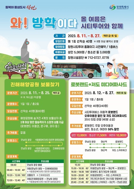 경남 창원시는 여름방학을 맞아 자녀와 함께 특별한 추억을 쌓을 수 있도록 오는 11일부터 시티투어버스 특별노선을 운행하며, 4일부터 예약을 받는다고 1일 밝혔다.