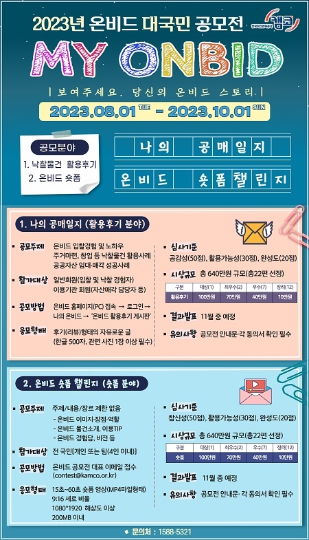 한국자산관리공사(캠코)가 오는 10월 1일까지 온비드 대국민 공모전 ‘MY ONBID’를 개최한다고 밝혔다.
