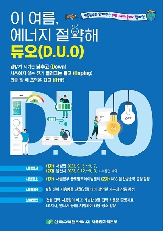 가구당 하루 1kWh 에너지 절약 캠페인 '올여름, 에너지 절약해 D.U.O'는 냉방기기 사용은 줄이고(Down), 사용하지 않는 전기 플러그는 뽑고(Unplug), 사용하지 않는 조명은 끄기(Off)를 통해 전력 사용량이 가장 많은 8월 전력 사용량을 전월 대비 절약하면 소정의 기념품을 200명에게 선착순으로 증정한다.