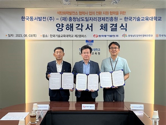 한국동서발전은 석탄발전소 상주 협력사 근로자의 일자리 전환을 위해 충남도 일자리경제진흥원, 한국기술교육대학교와 '협력사 업의 전환 지원' 공동협약을 3일 오후 1시 충남 천안시 한국기술교육대학교에서 체결했다.