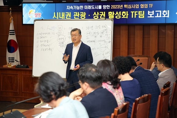 경남 밀양시는 지난달 28일부터 영남권 허브도시 밀양을 위한 핵심사업 협업 TF별 추진사항 보고 및 아이디어 도출을 위한 회의를 이어가고 있다.