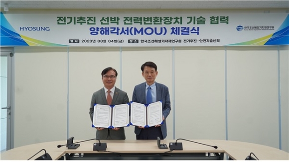 한국조선해양기자재연구원(KOMERI)이 효성과 친환경 하이브리드 전기추진 시스템 분야의 기업 기술 경쟁력 강화를 위한 업무협약을 체결했다고 4일 밝혔다.