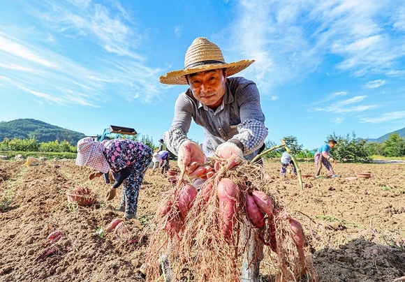 4일 오전 경남 산청군 단성면 창촌리 고구마밭에서 김영민 부농농장 대표와 작업자들이 밤고구마 수확에 구슬땀을 흘리고 있다. 산청 지리산 밤고구마는 모래가 섞인 빨간 황토흙에서 자라 영양분이 풍부하고 당도가 높으며, 특히 통기성이 좋고 배수가 잘되는 산청의 재배환경으로 육질이 단단하며 삶았을 때 포근포근한 식감이 특징이다. (사진=산청군 제공)