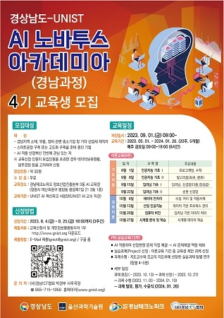 경남테크노파크(이하 경남TP)는 경남도, 울산과학기술원(이하 UNIST)과 함께 4일부터 25일까지 경남 소재·부품·장비 특화단지 AI교육인 인공지능(AI) 노바투스 아카데미아 경남과정 4기 교육생을 온·오프라인으로 모집한다.