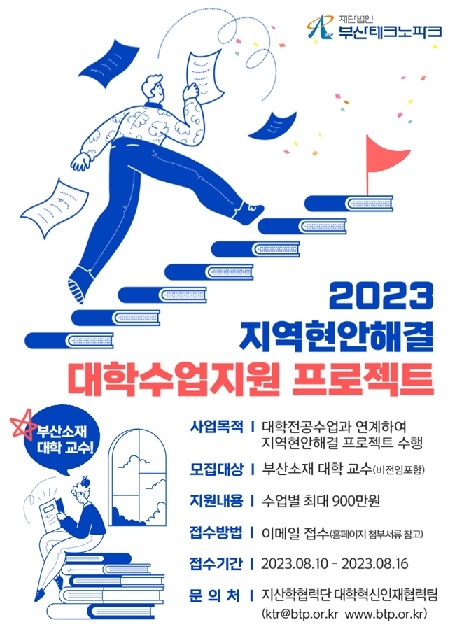 부산테크노파크(TP)가 오는 16일까지 ‘2023 지역현안해결 대학수업지원 프로젝트’ 공모를 진행한다고 밝혔다.