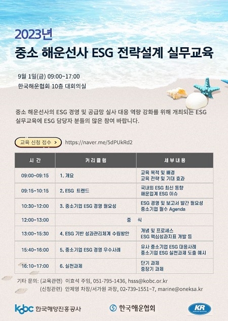 한국해양진흥공사가 오는 9월 1일 여의도 해운빌딩에서 ‘2023년 중소 해운선사 ESG전략설계 실무교육’을 한국해운협회․한국선급과 공동 개최한다고 밝혔다.