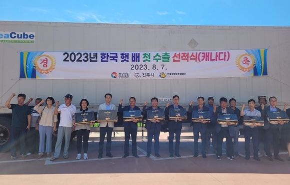 경남 진주시는 7일 농산물 수출단지 중 하나인 문산읍 소재 한국배영농조합법인에서 생산한 햇배를 캐나다 밴쿠버로 수출하기 위해 첫 선적했다고 밝혔다.
