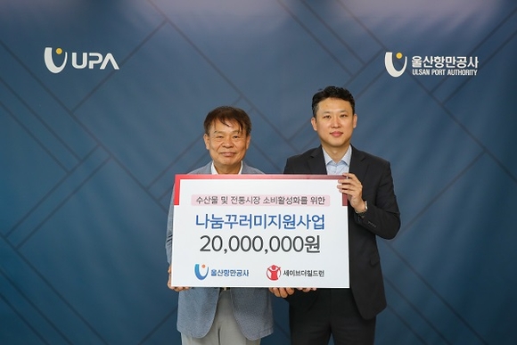 울산항만공사(UPA)가 7일 오전 10층 사장실에서 세이브더칠드런 동부지역본부를 통해 전통시장 활성화 및 취약계층 지원 사업에 필요한 기금 2000만 원을 전달했다.