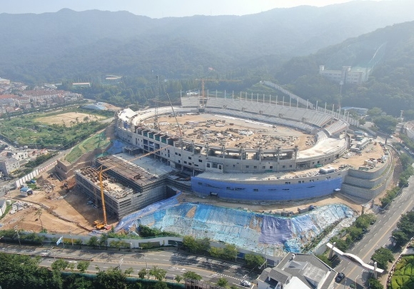 지하 5층~지상 3층, 연면적 6만 8370㎡, 관람석 1만 5066석 규모 김해종합운동장은 지난달 말 기준 공정률 46.5%로 주경기장 골조공사(철근콘크리트) 마무리 작업과 지붕 철골공사를 진행 중이며 9월까지 주요 골조공사를 모두 완료해 올 연말 공정률이 75%에 이를 전망이다.
