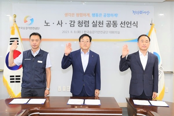 한국승강기안전공단(KoELSA)가 이사장, 노동조합위원장, 상임감사가 한자리에 모여 청렴·윤리경영을 다짐하는 '노·사·감 청렴 실천 공동 선언식'을 8일 개최했다.