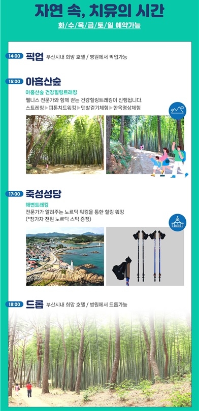 웰니스원데이투어 프로그램은 부산을 방문하는 외국인 환자와 환자 가족을 위해 의료서비스와 관광자원을 결합한 웰니스 의료관광상품으로 부산이 보유한 웰니스 자원을 활용해 4시간, 8시간 투어 코스로 총 6개 코스가 개발되어 운영될 예정이다.