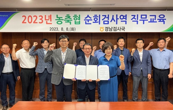 농협 경남검사국은 지난 8일 경남지역본부 회의실에서 '순회검사역 직무교육'과 '윤리강령 및 3행 3무 실천결의대회'를 가졌다고 밝혔다.