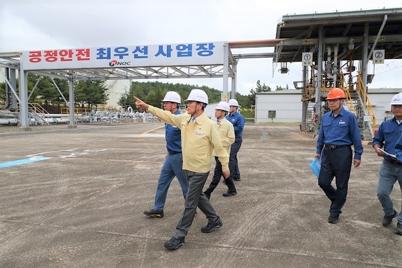한국석유공사 김동섭 사장이 지난 8일 동해비축기지를 방문, 지상탱크와 파이프라인 등 현장 시설물의 유지보수 상태를 점검하고 여름철 현장 근무자들에 대한 안전교육을 실시했다.