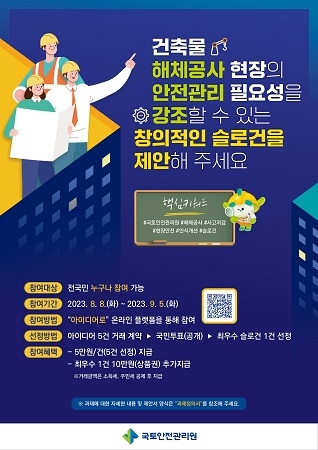국토안전관리원(이하 관리원)은 9일 건축물 해체공사와 관련한 안전의식을 높여줄 슬로건 아이디어를 다음달 5일까지 공개 모집한다고 밝혔다.