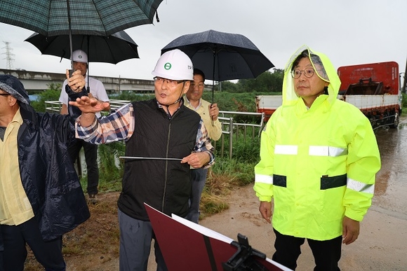 임시 침사지와 가배수로 설치 상태, 토사 유출과 비탈면 붕괴위험 여부, 임시간판 등 강풍 시 피해 우려 시설, 하천제방 범람취약지역 안전대책, 도심하천 산책로 통제 상황을 살핀 홍 시장은 인명피해가 없도록 사전대비에 최선을 다하라고 지시했다.