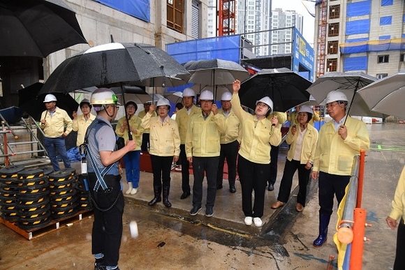 현장에서 의원들은 진주시 주택경관과와 도로과의 브리핑을 통해 태풍에 대한 진주시의 사전 대책을 청취하고 재해 안전시설의 운영 현황을 점검했다. 특히 공동주택 시공업체 포스코이앤씨는 타워크레인 3대 등 시설물에 대한 조치 현황과 비상대응체계를 상세히 설명했다.