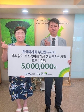 한국마사회 부산동구지사는 지난 3일 부산시 동구 관내 거주 저소득 아동가정을 위한 생필품 지원사업 ‘초록이 점빵’에 기부금 500만 원을 지원했다.