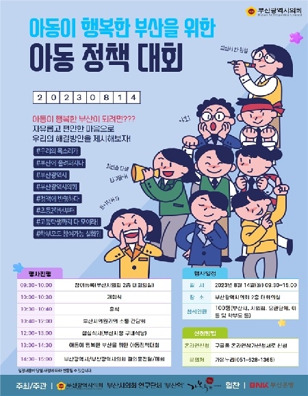 아동정책대회는 교육·안전·문화·복지분야를 비롯해서 생존권·보호권·발달권·참여권 등 다양한 분야에서 아이들이 관심있는 영역을 직접 선택하게 하고 ‘부산역’ 연구단체 시의원들과 소통 간담회를 통해 주제별 질의응답으로 시작한다. 이어 그룹별로 시의원과 아이들이 한팀이 되어 함께 정책을 만들고 제안할 예정이다. 정책대회를 통해 만들어진 분야별 제안사항은 결의문을 통해 부산시와 시의회에 전달된다.