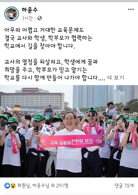 하윤수 교육감은 11일 자신의 페이스북에 “교사의 열정을 되살리고, 학생에게 꿈과 희망을 주고, 학부모가 믿고 맡기는 학교를 다시 함께 만들어 나가야 한다”는 글을 올렸다.