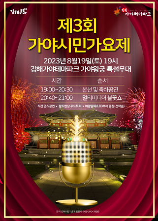 김해문화재단 김해가야테마파크가 개장 8주년 특집 '가야시민가요제'를 오는 19일 오후 7시에 개최한다. 올해 3회를 맞는 가야시민가요제는 지역을 대표하는 아마추어 가요제로 김해시민들의 실력과 끼를 발산하고 모두가 함께 즐길 수 있는 시민참여축제다.