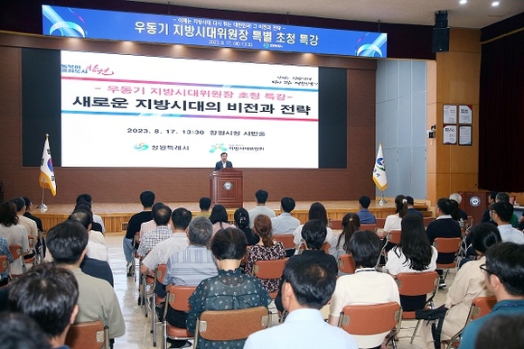 경남 창원시는 17일 시청 시민홀에서 대통령 직속 지방시대위원회 우동기 위원장을 초청해 지역균형발전 특강을 가졌다.