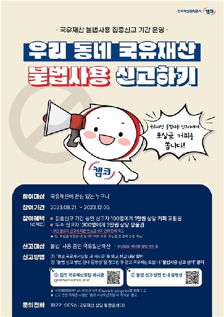 한국자산관리공사(캠코)가 오는 21일부터 12월 3일까지 ‘국유재산 불법사용 집중신고 기간’을 운영한다고 밝혔다.