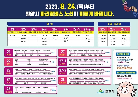 경남 밀양시는 대중교통 비운행 지역 주민들의 이동권보장 및 아리랑버스 활성화를 위해 오는 24일부터 기존 아리랑버스 9개 노선 중 8개 노선을 개편하고 1개 노선을 신설한다고 18일 밝혔다.
