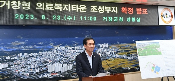 경남 거창군은 23일 군청 상황실에서 열린 기자회견을 통해 지역책임의료기관인 거창적십자병원 이전을 포함하는 거창형 의료복지타운 조성부지를 확정 발표하면서, 총사업비 2889억 원에 달하는 의료복지타운 조성사업이 본궤도에 올랐다고 밝혔다.