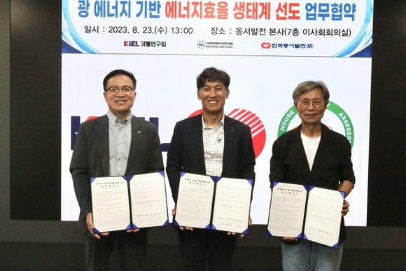 한국동서발전은 키엘연구원, 한국주택에너지진단사협회와 '광 에너지 기반 에너지효율 생태계 선도 업무협약'을 23일 오후 1시 울산 중구 본사에서 체결했다.