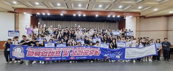 경남대학교 LINC3.0사업단은 지난 19일 대전 KT인재개발원 제2연수관에서 'KBO NINE 시즌 2023 성과공유회'를 가진 후 단체 기념촬영을 했다. (사진=경남대 제공)