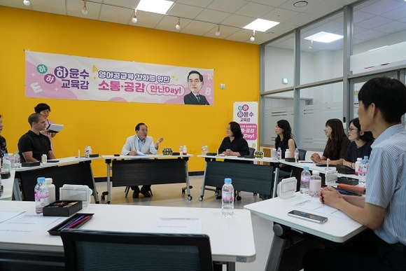 부산시교육청이 25일 오후 시교육청 별관 1층 교육감소통공감실에서 영어 교사, 원어민 보조교사, 학부모 등 11명이 참석한 가운데 ‘영어 공교육 강화를 위한 소통·공감 만난 Day!’행사를 개최했다.