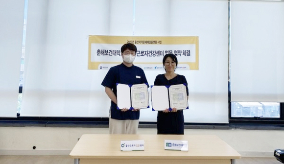 춘해보건대학교와 울산근로자건강센터는 25일 울산근로자건강센터 회의실에서 '2023년 산업재해 트라우마 관리를 통한 행복도시 울산 건설'이라는 지역문제해결플랫폼 실행의제로 업무협약을 체결했다.