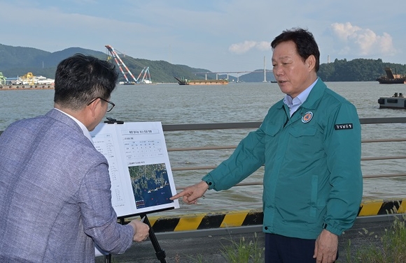 이어 박 도지사는 마산항 제2부두의 해양 방사능 조사 지점을 찾아 해양수산국장으로부터 해양 방사능 조사 현황에 대해 설명을 들었다.