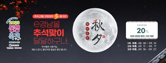 먼저 e경남몰에서 30일부터 9월 27일까지 농축수산물 등 추석기획전 품목에 대해 20% 할인쿠폰을 발행하는 한가위 기획전을 개최하며, 같은 기간에 진행되는 다른 기획전의 할인쿠폰과 중복하여 사용할 수 있다.